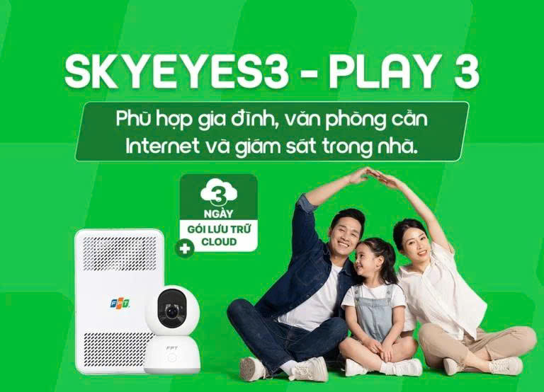 SkyEyes3 – Play 3 – Gói combo Internet tốc độ cao kèm Camera FPT Play3 tích hợp loa và micro cho đàm thoại hai chiều, cảnh báo âm thanh thông minh. Dễ lắp đặt, dễ quản lý, đáp ứng mọi nhu cầu trực tuyến và giám sát an ninh hiệu quả.